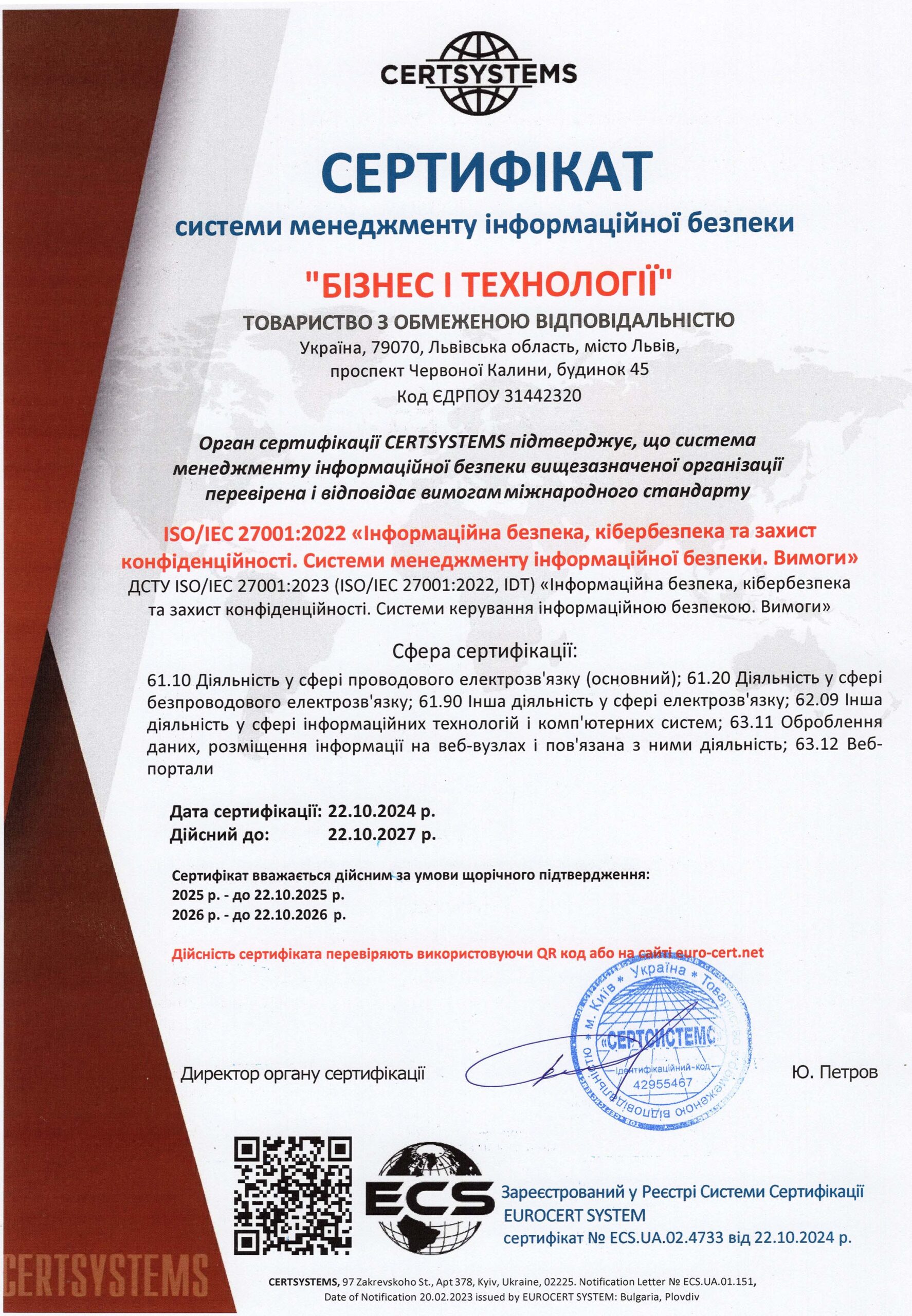 Сертифікат системи менеджменту і інформаційної безпеки (УКР)