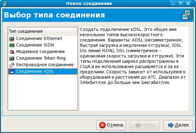 2. У списку Тип з’єднання, виберіть З’єднання xDSL, натисніть кнопку Далі.