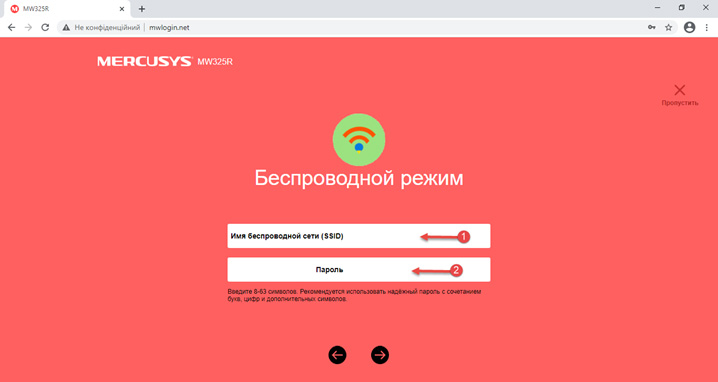 Для того, щоб налаштувати свою Wi-Fi мережу необхідно змінити стандартну назву Wi-Fi і стандартний пароль мережі на свій розсуд (наприклад: WiFi-homе, MyWIFI) та виберіть далі.