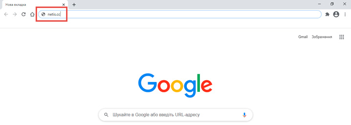 На своєму компютері або смартфоні відкрийте інтернет браузер (Google Chrome, Mozilla Firefox, Opera, Internet Explorer), де в адресному рядку (не в пошуковому) введіть адресу сторінки налаштування роутера. Конкретна адреса знаходиться на наклейці вашого роутера . В даному випадку у нас netis.cc і натискайте Enter.