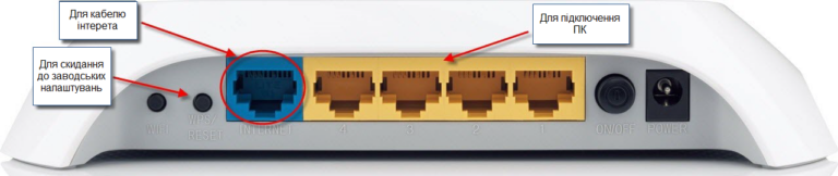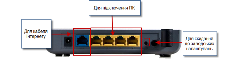 До жовтого роз’єму «Internet» під’єднайте кабель інтернету. До одного з синіх портів «Ethernet» підключіть ваш комп’ютер.