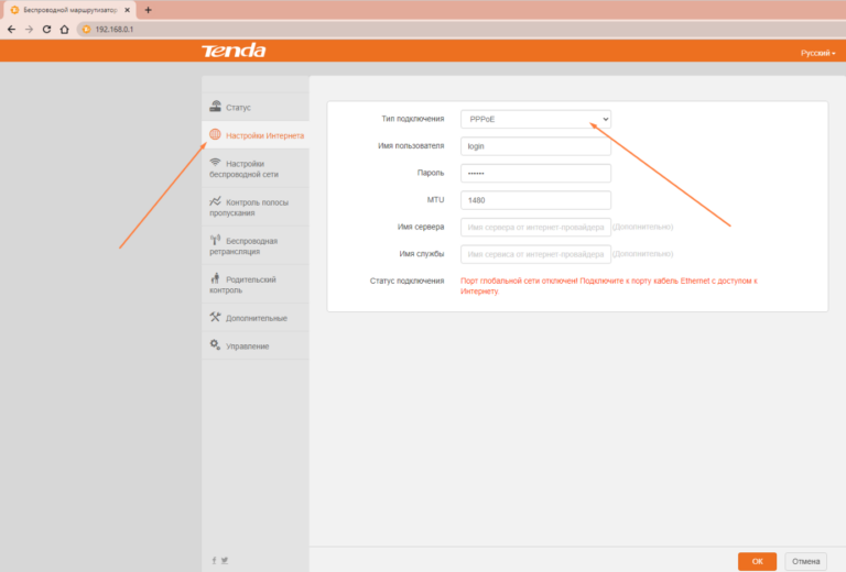 Після входу в меню налаштувань відкрийте розділ «Мережа», пункт WAN та виберіть тип підключення PPPoE або PPPoE Россия.