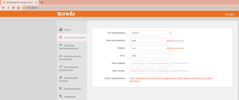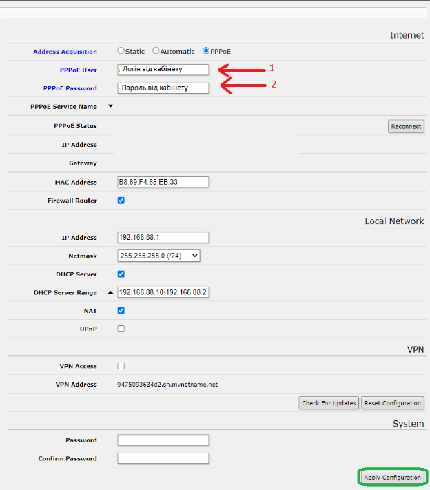– Ввести ім’я користувача (РРРоЕ погін) та пароль, надані провайдером, у відповідні поля.