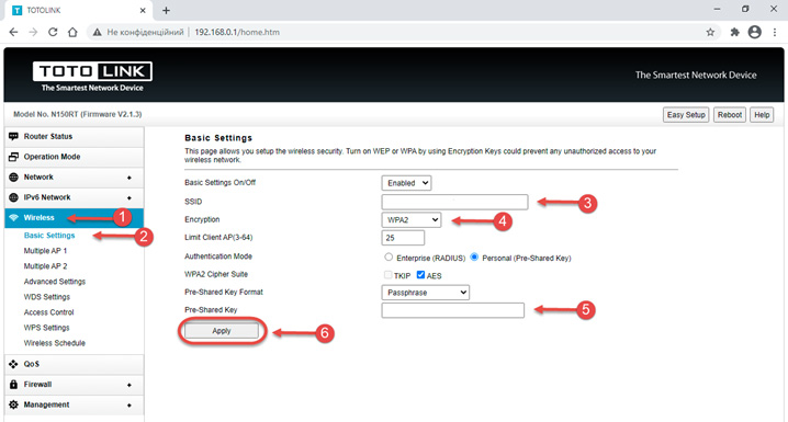 Для того, щоб налаштувати свою Wi-Fi мережу необхідно: перейти у розділ «Wireless» і обрати «Basic Settings». Змініть стандартну назву Wi-Fi мережі на свій розсуд (наприклад: WiFi-homе, MyWIFI) та збережіть.