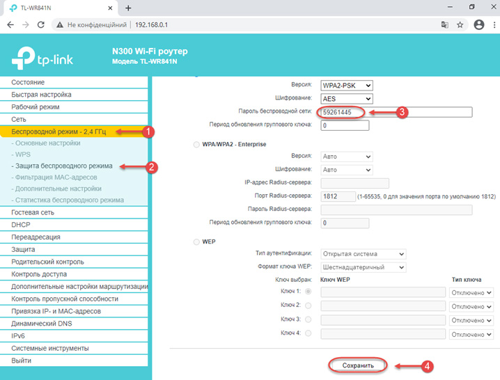 Після налаштування назви вашої Wi-Fi мережі рекомендується змінити стандартний пароль. Для цього виберіть «Захист безпровідного режиму» і в рядку Пароль безпровідної мережі» введіть бажаний пароль. Збережіть внесені зміни.