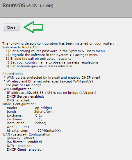 Нам відкривається меню з наявними налаштуванням роутера, нажимаємо кнопку “Close”.