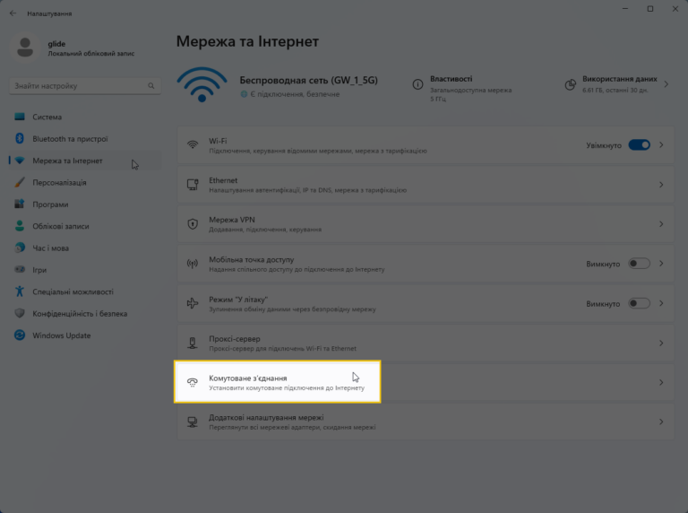 3. Оберіть пункт “Комутоване з’єднання“.