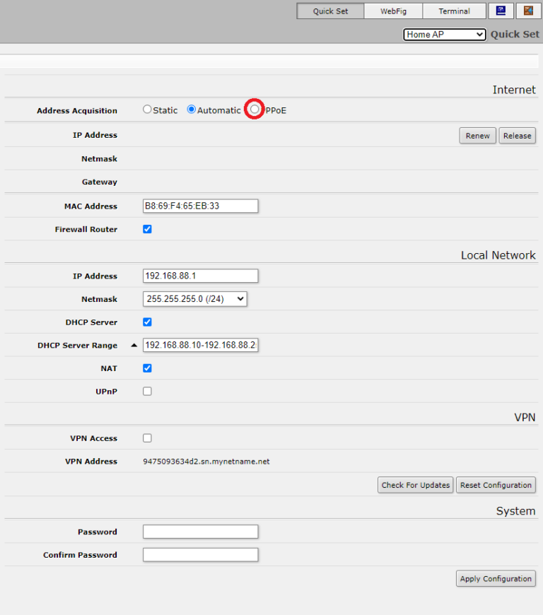Для цього у рядку “Address Acquisition” обираємо тип підключення PPPoE.