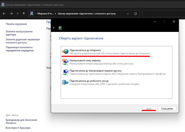 5. Оберіть пункт “Підключитися до Інтернету”, після цього натисніть “Далі“.