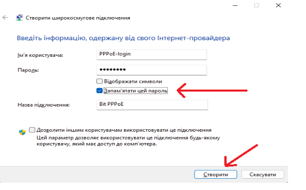 7. Введіть Ваш логін та пароль для підключення PPPoE зазначений у договорі, додатково можна поставити галочку “Запам’ятати цей пароль” та натисніть кнопку “Створити”.